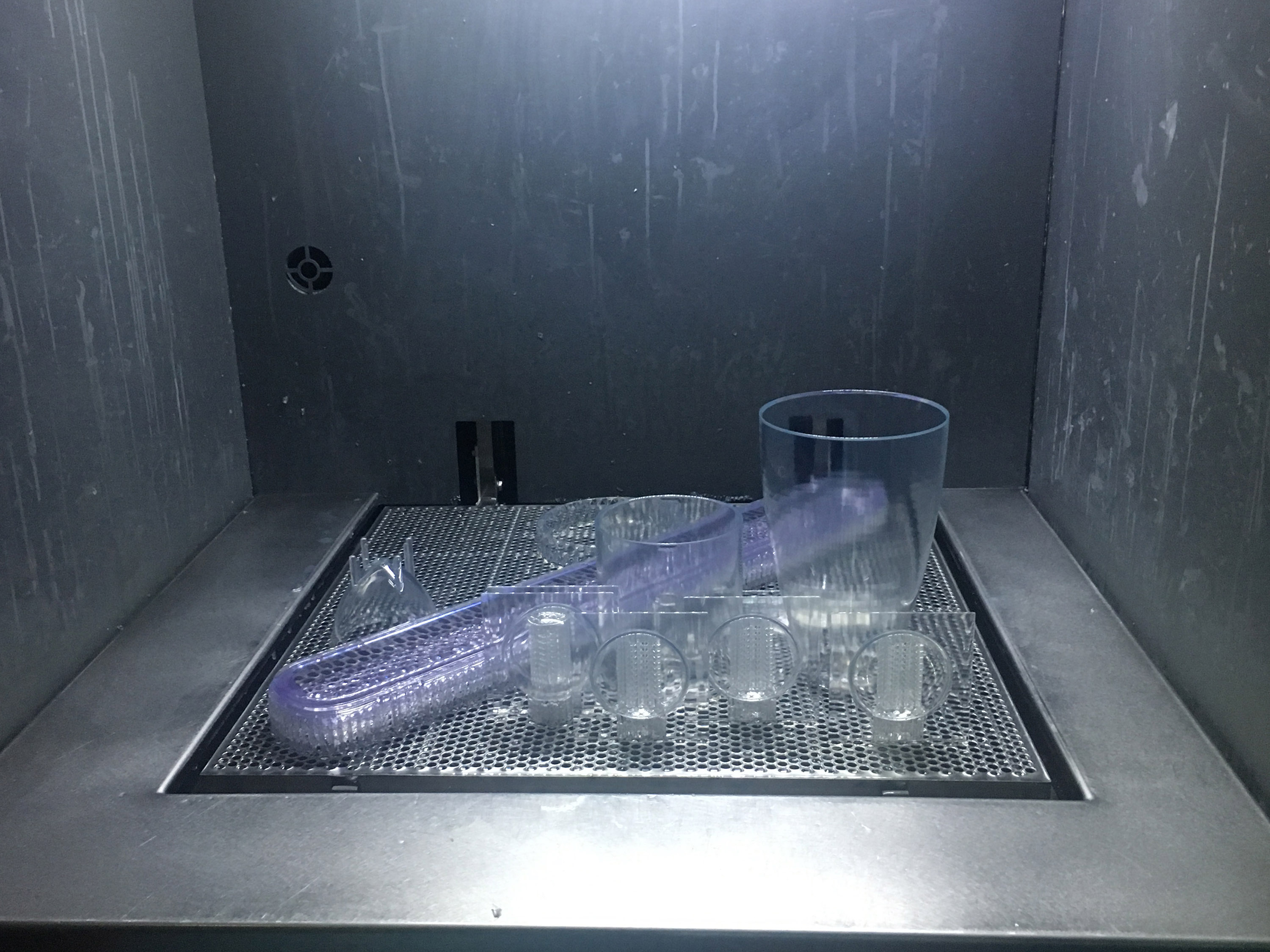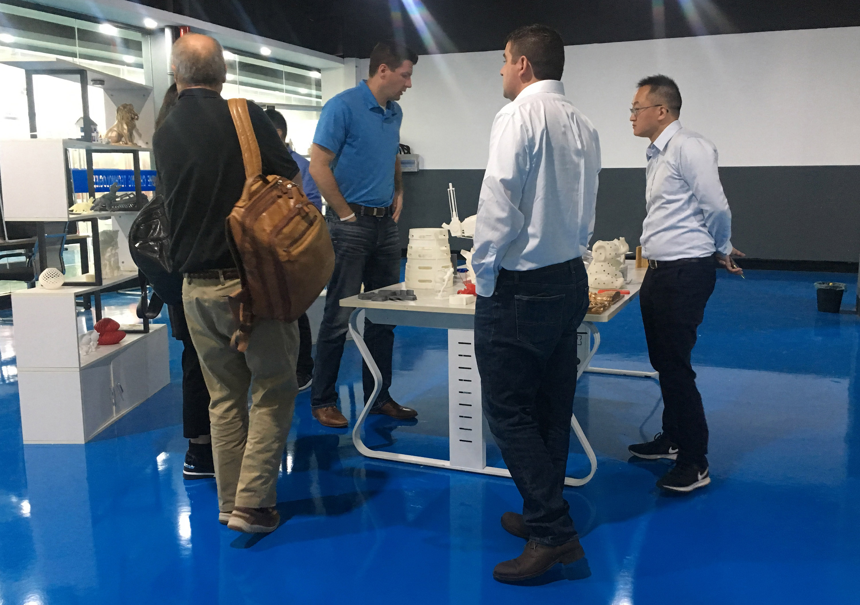 在陶董事長的帶領下,美國客戶一行先行參觀浙創科技3D打印車間。陶董事長詳細介紹了3D打印機的工作原理,并向美國客戶展示了打印完成的整套茶具模型。呈現在客戶面前的并不是最終的手板模型,還會通過專業的后處理進行加工,力求優質。針對美國客戶手板打印的需求,陶董事長提出通過“3D掃描+工業設計+3D打印”的一站式解決方案,為客戶打印樣品用于驗證,從而減少客戶的研發成本。