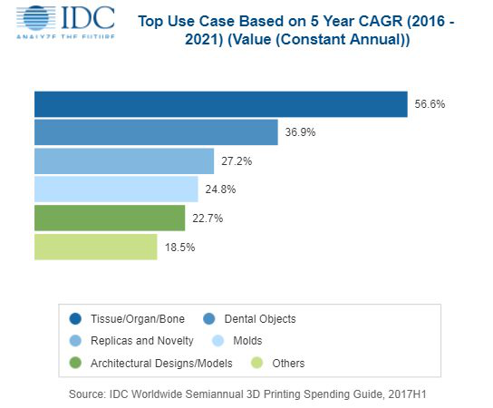 IDC還確定哪些制造行業(yè)在3D打印技術(shù)上花費(fèi)最多。3D打印將由三大產(chǎn)業(yè)主導(dǎo):汽車,航空航天和醫(yī)學(xué)支出最為顯著,占IDC預(yù)測(cè)期間全球支出的一半以上。行業(yè)分析離散制造,如汽車,飛機(jī)和玩具等不同的項(xiàng)目,預(yù)計(jì)將出現(xiàn)在支出之上。其次,3D打印在醫(yī)療保健方面,預(yù)計(jì)2018年的總支出將近13億美元。醫(yī)療保健部門將越來(lái)越多地轉(zhuǎn)向3D打印以制造手術(shù)指南,矯形裝置,植入物等。預(yù)計(jì)醫(yī)療保健行業(yè)在五年預(yù)測(cè)期間的復(fù)合年增長(zhǎng)率將達(dá)到35.4%。